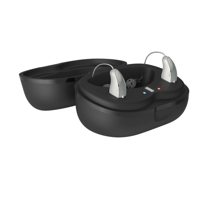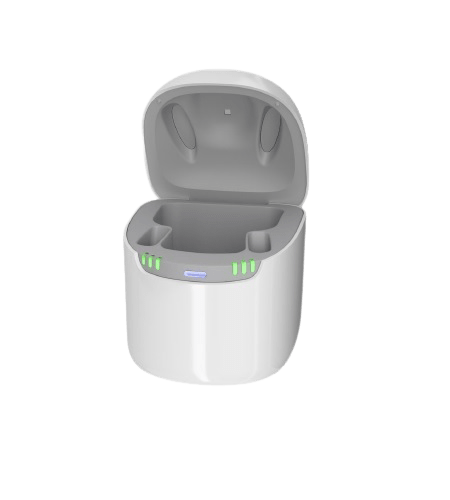 - Le chargeur standard RIC : servant de station de charge et d’étui et doté de voyants lumineux en façade pour indiquer l’état de charge des aides auditives. Compatible avec les RIC et BTE Evolv AI.